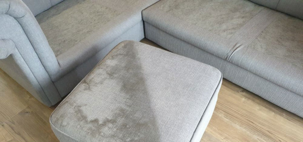 Heavily stained corner ‘L’ sofa saved and brought back to life. Stains treated and removed, hand scrubbed, de-odourised and shampoo extrac…
